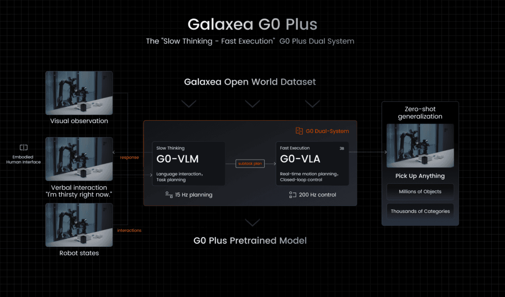 Galaxea Dynamics hat sein G0Plus VLA-Modell als Open Source veröffentlicht, inklusive einer „Pick Up Anything“-Demo, die ohne spezielles Training funktioniert. Ein Roboter soll Dinge greifen können, die er noch nie zuvor gesehen hat und zwar allein auf Basis einer Sprachaufforderung.